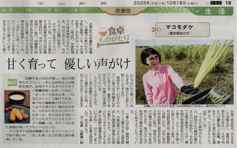 岡田農園のマコモダケは、栽培期間中、農薬と化学肥料を使用せずに生産されています。